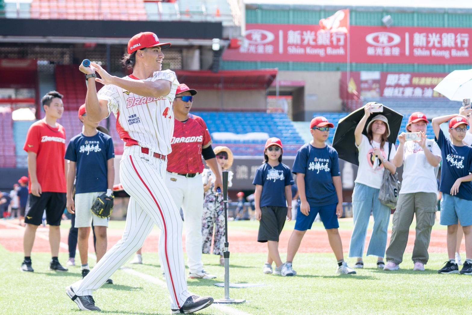 他特別來到天母棒球場參加「兒童棒球體驗營」,鼓勵在場的孩子們為他加油,並與他們一同融入比賽,陪伴學童度過歡樂的午後。