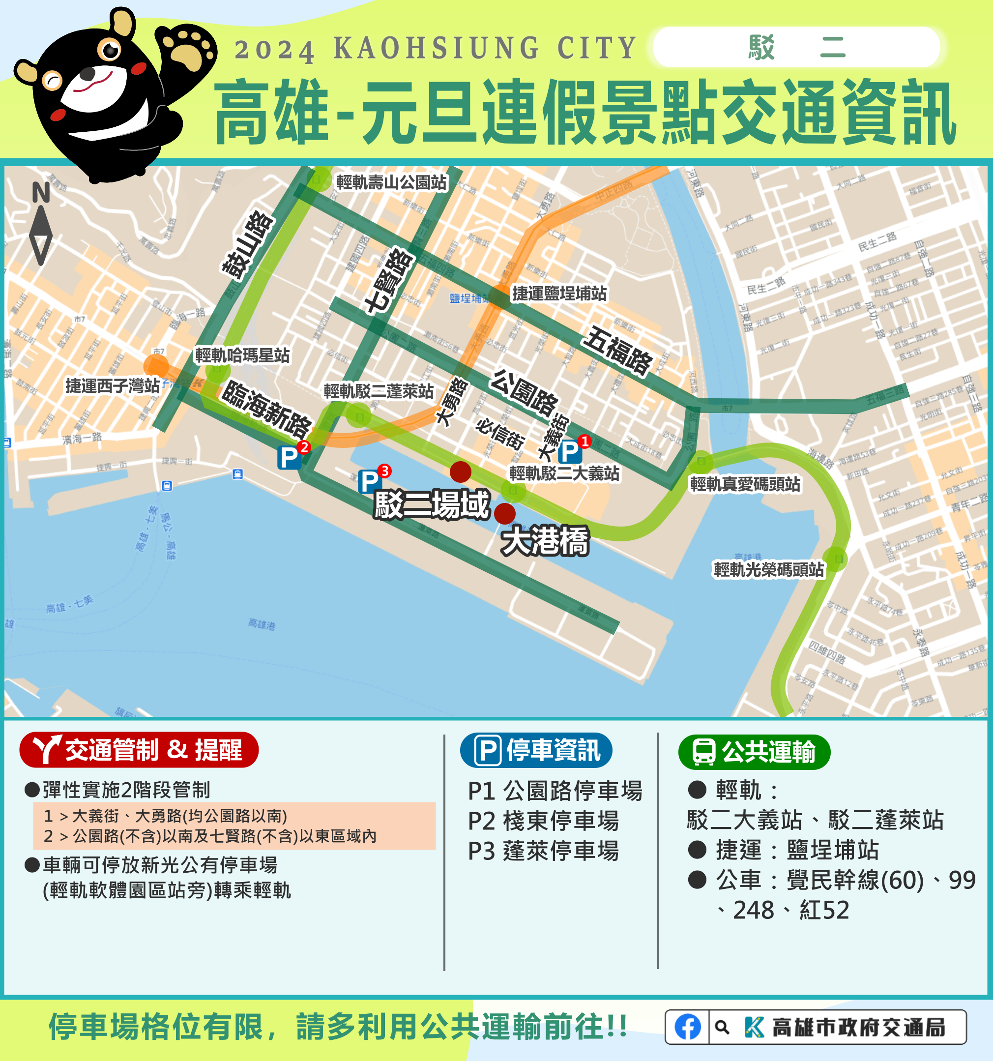 113年元旦3天連假高雄市有夢時代跨年晚會、義大世界跨年焰火等活動,活動會場及各景點周邊人車潮眾多,停車位有限,捷運、輕軌配合機動加密班次疏運,鼓勵大家多搭乘公共運輸前往,省錢又便利,避免塞車與停車焦慮。